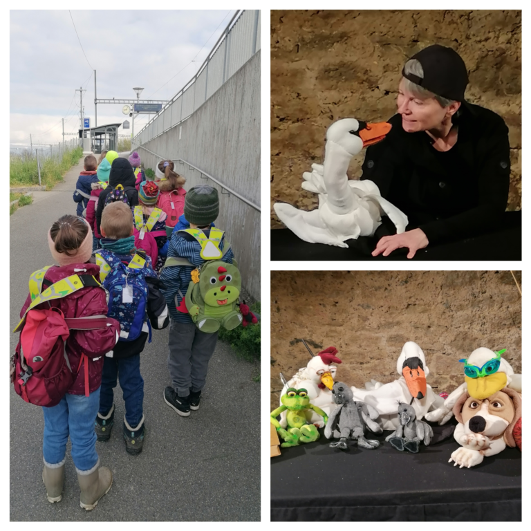In diesem Schuljahr stand an den Schulen im Kanton Bern die Leseförderung im Vordergrund. Im Kindergarten C haben wir daher versucht, einen Bücherberg zusammenzutragen, der bis zur Decke reicht. Bei jedem ausgeliehenen Bibliotheksbuch, welches den Kindern von ihren Eltern vorgelesen wurde, oder bei allen Büchern, die sie als ganze Klasse im Kindergarten gehört haben, wurde unser Bücherberg um einen Streifen ergänzt. Vor den Frühlingsferien haben wir dann unser Ziel erreicht. Als Belohnung für das erreichte Ziel, sind wir kurz nach den Ferien ins Puppentheater nach Ins gereist, wo wir uns von einer spannenden Geschichte verzaubern lassen konnten.