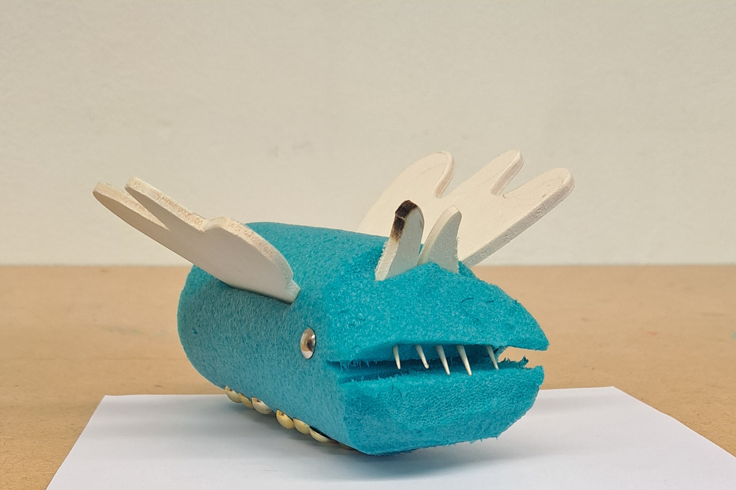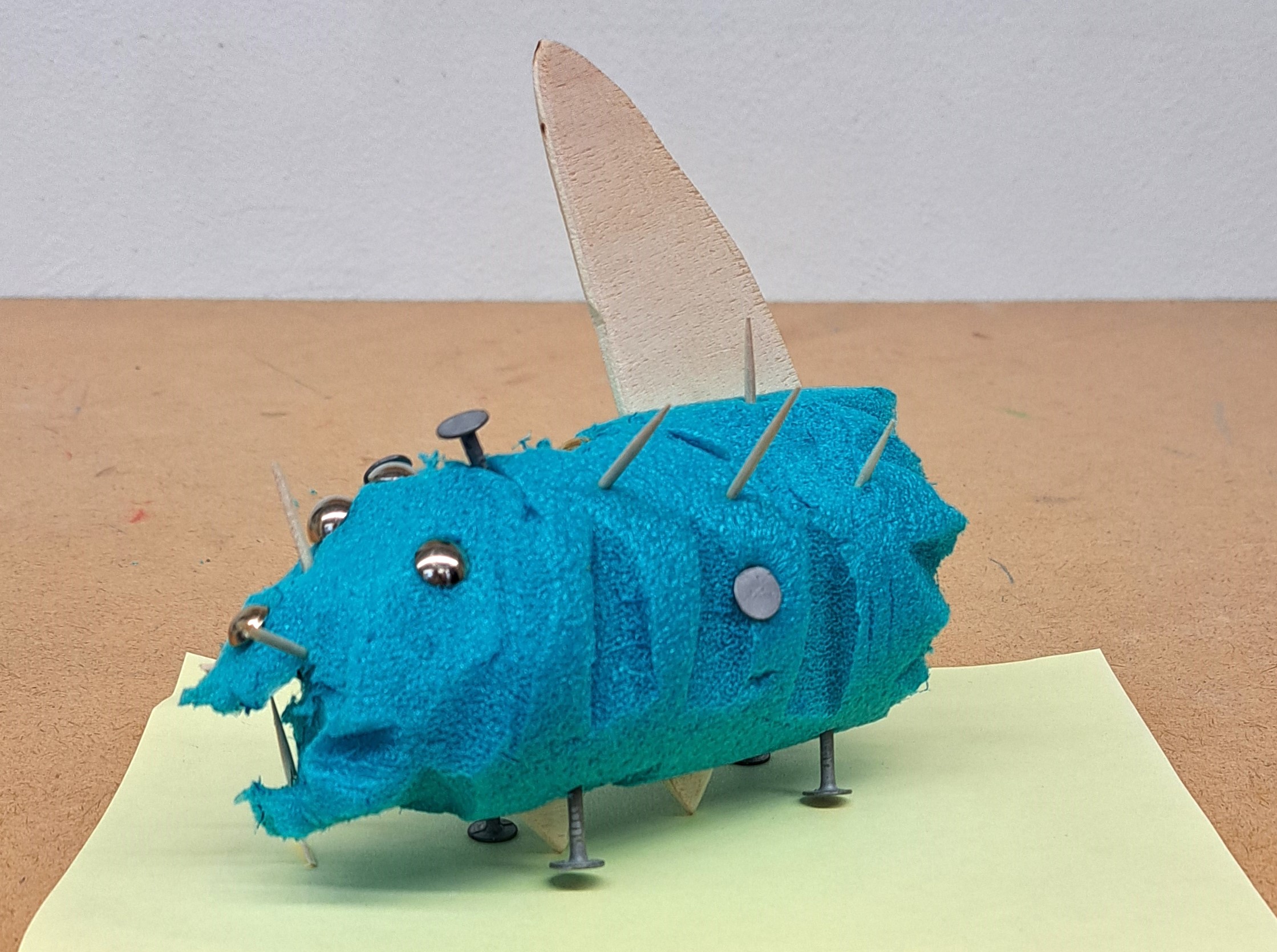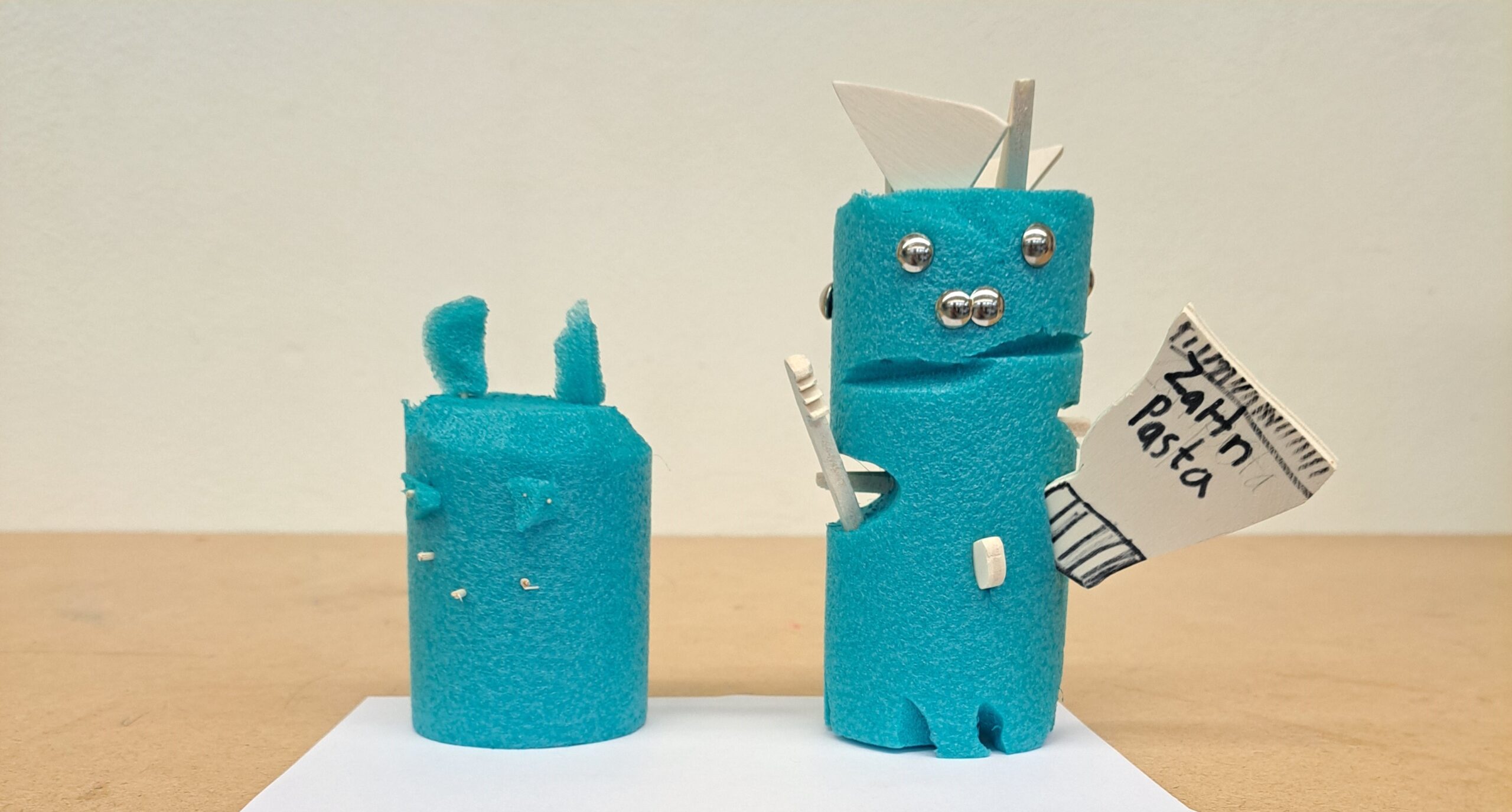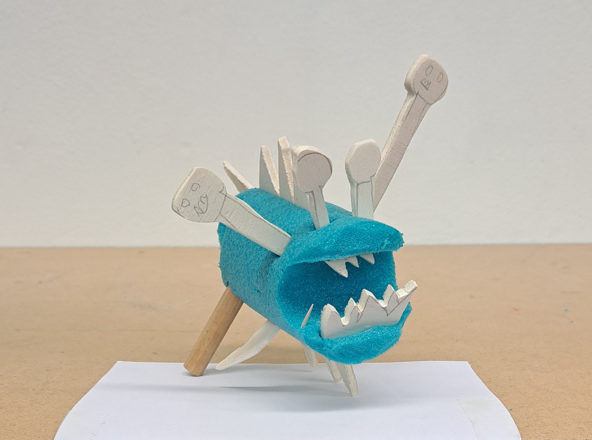Nach dem Vorbild des Ungeheuers von Loch Ness haben die Schülerinnen und Schüler ihre eigenen Seeungeheuer erfunden. Mit der Thermosäge wurden die Poolnudel-Stücke bearbeitet und anschliessend mit Holz und Nägel besteckt.