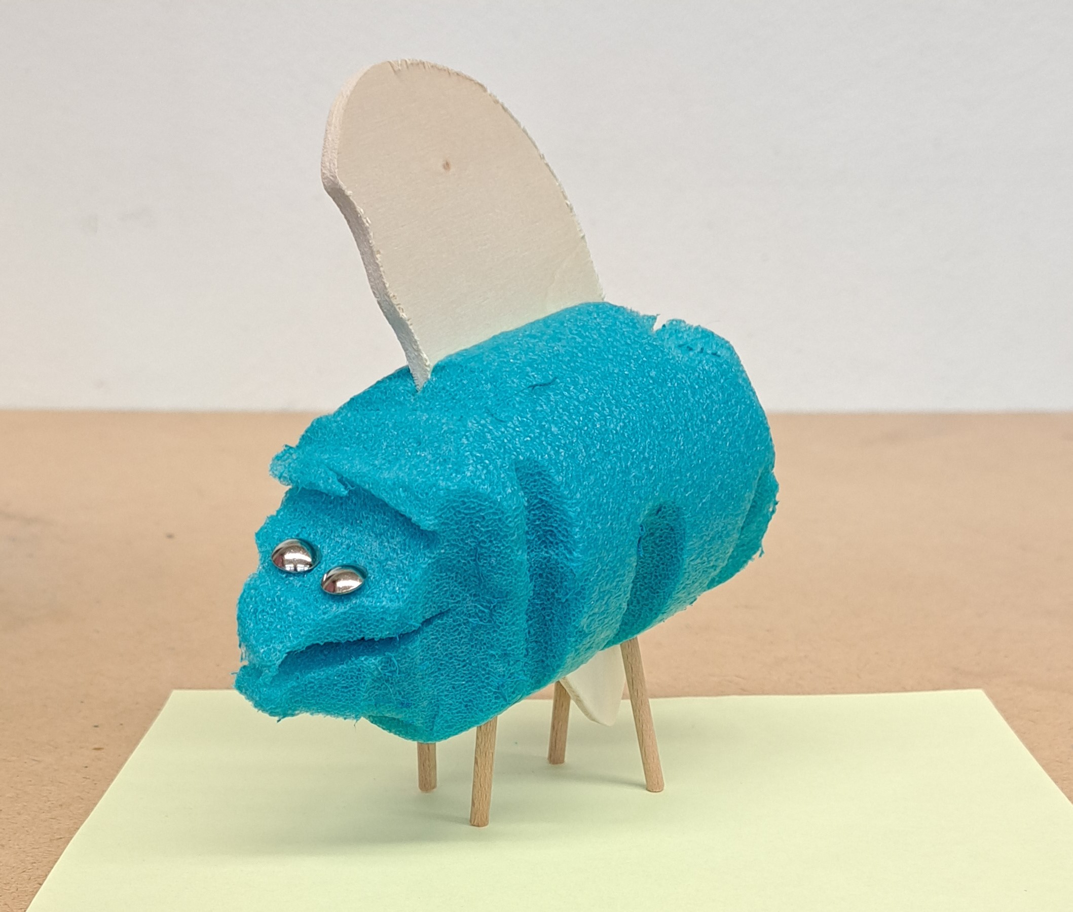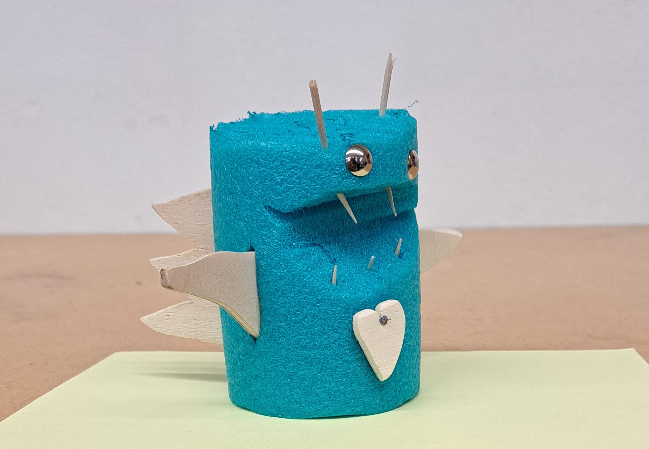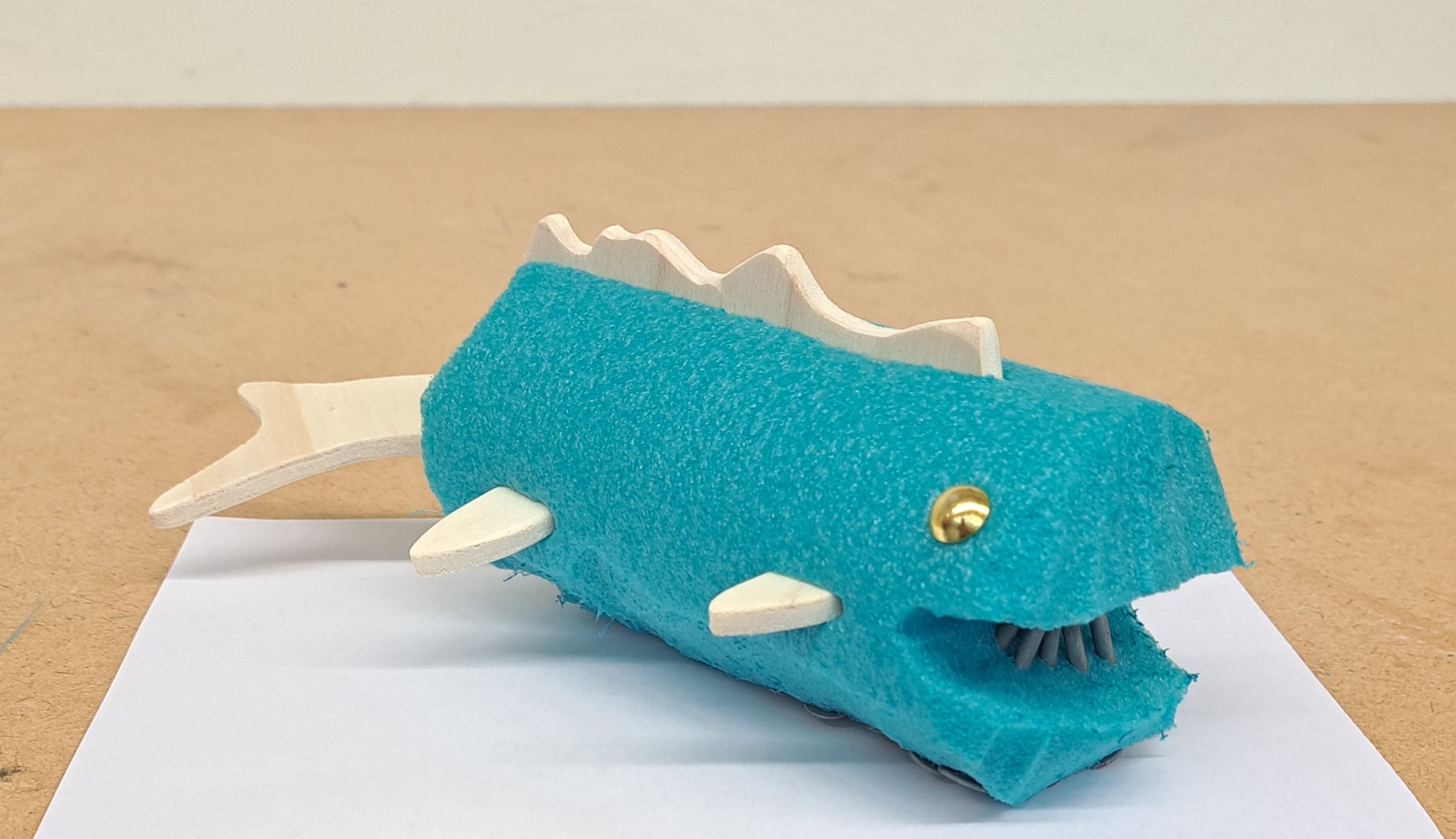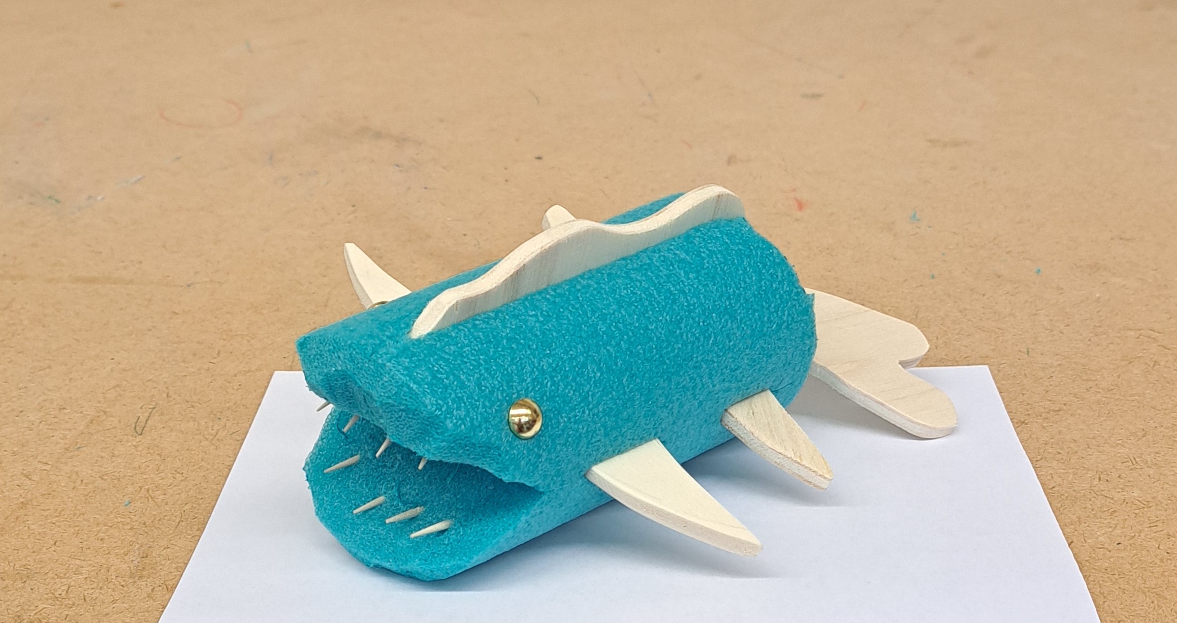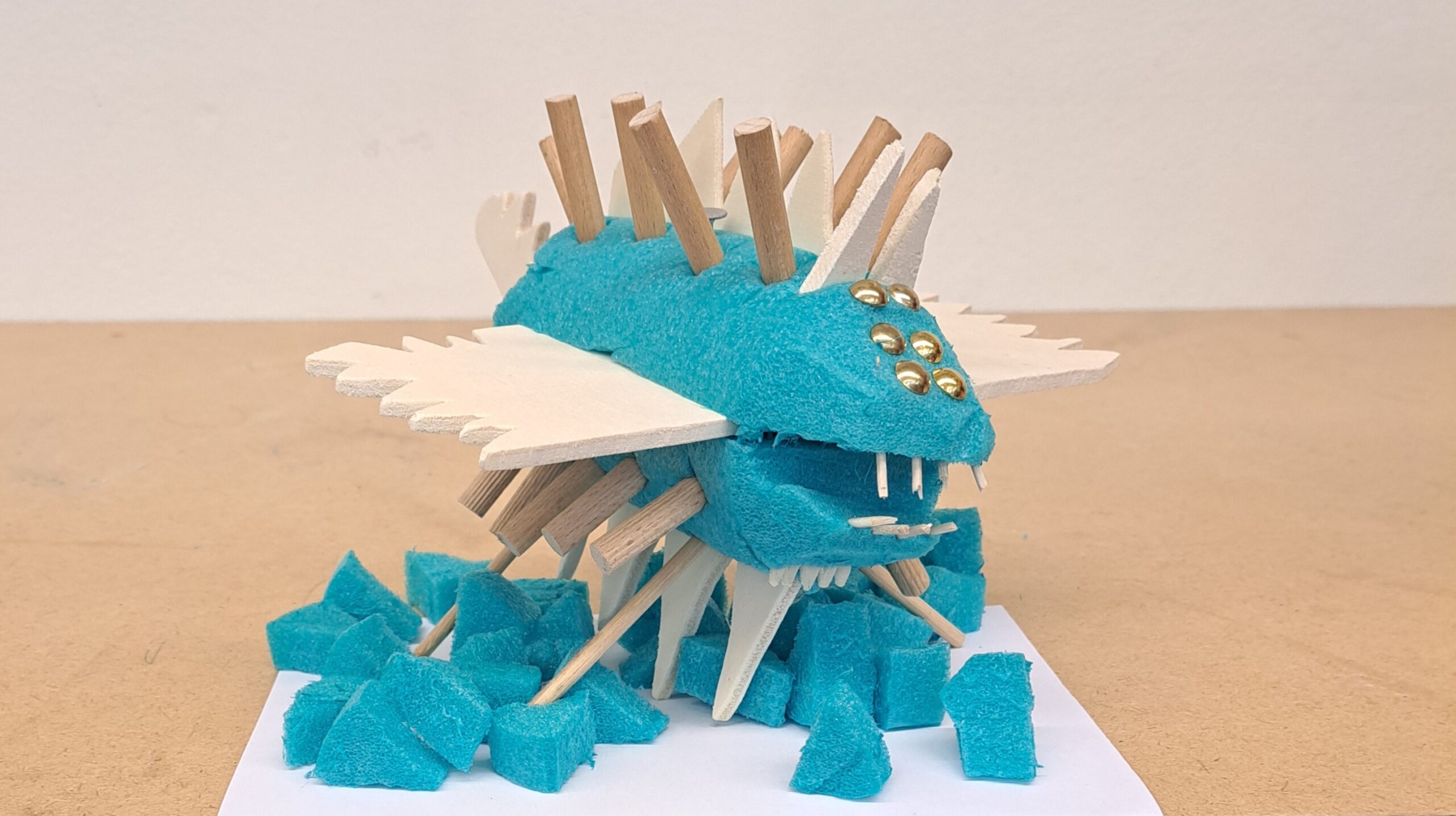 Nach dem Vorbild des Ungeheuers von Loch Ness haben die Schülerinnen und Schüler ihre eigenen Seeungeheuer erfunden. Mit der Thermosäge wurden die Poolnudel-Stücke bearbeitet und anschliessend mit Holz und Nägel besteckt.